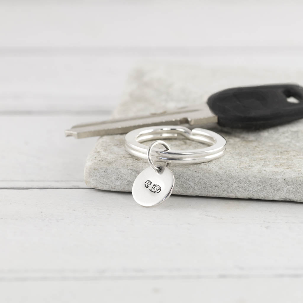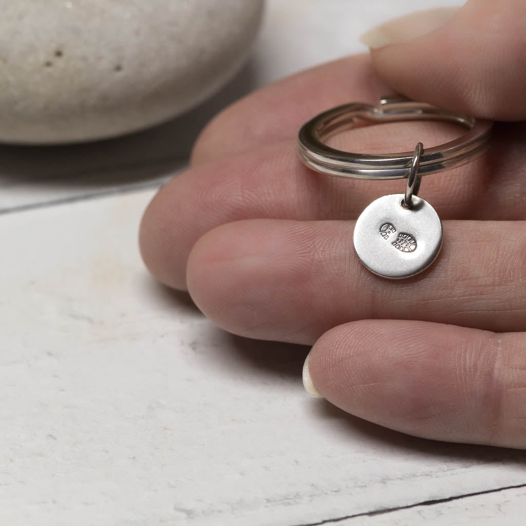 Each small disc is carefully stamped by hand, making each piece unique. Perfect for hikers and outdoor enthusiasts, this keyring adds a touch of fun to your everyday essentials.