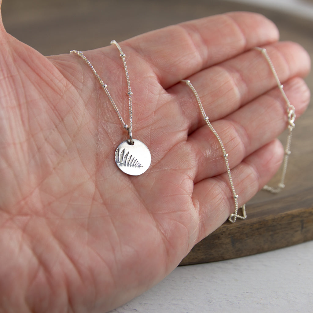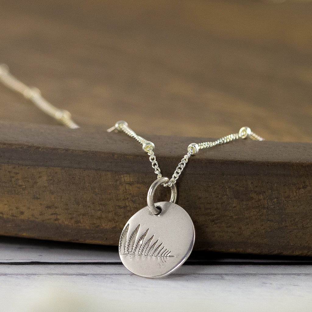 This pretty silver fern design has been hung on a beautiful 18 inch satellite chain.
